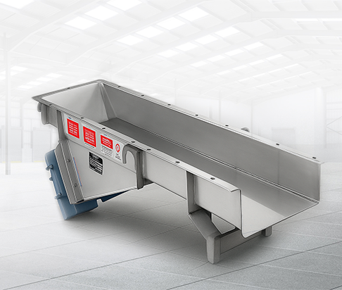 The welded feeder trough is mounted on springs, minimizing vibration transfer to the supporting frame while ensuring efficient conveying. Amplitude and feed rate are adjustable for flexible operation.